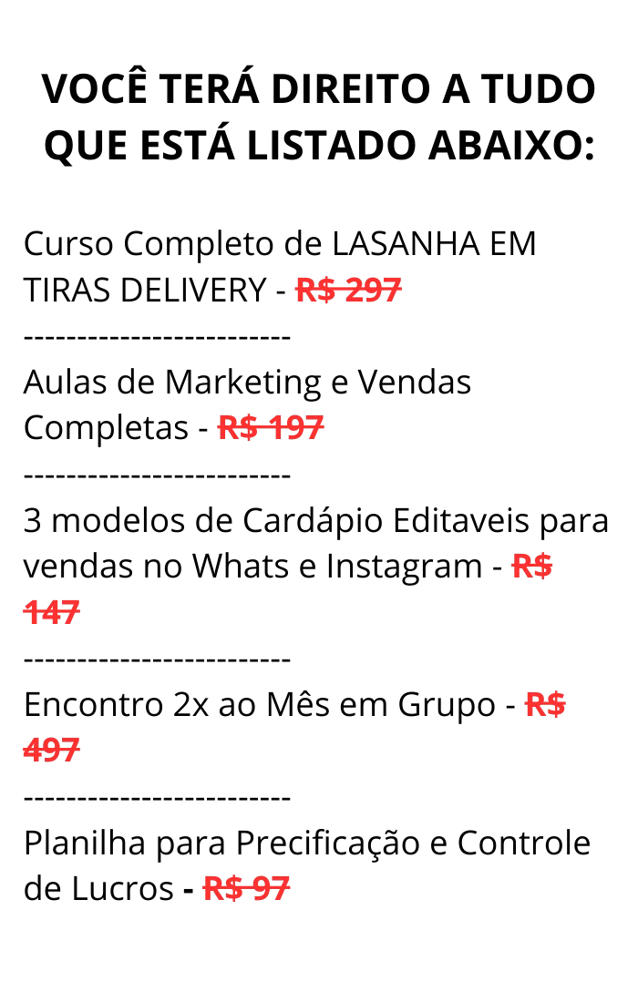 Você irá aprender a montar um negócio de LASANHA EM TIRAS DELIVERY da cozinha da sua casa e realmente ter a liberdade financeira desejada.